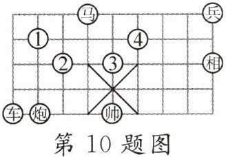10. 在如图所示的象棋盘(各个小正方形的边长均相等)中,根据“马走日”的规则,要使“马”“车”“炮”所在位置的格点构成的三角形与“帅”“相”“兵”所在位置的格点构成的三角形相似,则“马”应落在()