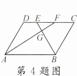 4. 如图,四边形ABCD为平行四边形,E,F为边CD的两个三等分点,连接AF,BE交于点G,则$S _ { \triangle E F G } : S _ { \triangle A B G } = $______.