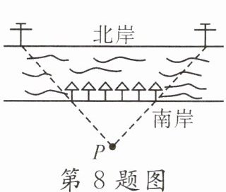 8. 如图,一条河的两岸有一段是平行的,在河的南岸边每隔5m有一棵树,在河的北岸边每隔50m有一根电线杆. 小丽站在离南岸15m的点P处看北岸,发现北岸相邻的两根电线杆恰好被南岸的两棵树遮住,并且在这两棵树之间还有四棵树,则河的宽度为______m.