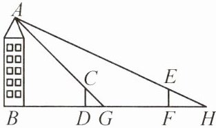 解:$ \because AB \perp BH $,$ CD \perp BH $,$ EF \perp BH $,$ \therefore \angle ABG = \angle CDG = \angle EFH = 90^{\circ} $。$ \because \angle CGD = \angle AGB $,$ \angle EHF = \angle AHB $,$ \therefore \triangle CDG \backsim \triangle ABG $,$ \triangle EFH \backsim \triangle ABH $,$ \therefore \frac{CD}{AB} = \frac{DG}{DG + BD} $,$ \frac{EF}{AB} = \frac{FH}{FH + DF + BD} $。由题意,得 $ CD = DG = EF = 2 \text{ m} $,$ DF = 52 \text{ m} $,$ FH = 4 \text{ m} $,$ \therefore \frac{2}{AB} = \frac{2}{2 + BD} $,$ \frac{2}{AB} = \frac{4}{4 + 52 + BD} $,$ \therefore \frac{2}{2 + BD} = \frac{4}{4 + 52 + BD} $,$ \therefore BD = 52 \text{ m} $,$ \therefore AB = 54 \text{ m} $。答:建筑物的高度为 $ 54 \text{ m} $。