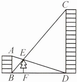 解:$ \because EF // AB $,$ \therefore \triangle DEF \backsim \triangle DAB $,$ \therefore \frac{DF}{DB} = \frac{EF}{AB} = \frac{4}{5} $。$ \because EF // CD $,$ \therefore \triangle BEF \backsim \triangle BCD $,$ \therefore \frac{BF}{BD} = \frac{EF}{CD} = \frac{4}{CD} $。$ \because \frac{DF}{BD} + \frac{BF}{BD} = \frac{DF + BF}{BD} = 1 $,$ \therefore \frac{4}{5} + \frac{4}{CD} = 1 $,$ \therefore CD = 20 \text{ m} $。答:楼的高度 $ CD $ 为 $ 20 \text{ m} $。