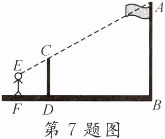 7. 九年级(1)班课外活动小组利用标杆CD测量学校旗杆AB的高度(标杆、旗杆均与地面垂直). 如图,已知标杆高度CD= 3m,标杆与旗杆的水平距离BD= 15m,人的眼睛与地面的高度EF= 1.6m,人与标杆CD的水平距离DF= 2m,人的眼睛E、标杆顶端C和旗杆顶端A在同一条直线上,则旗杆AB的高度为______m.