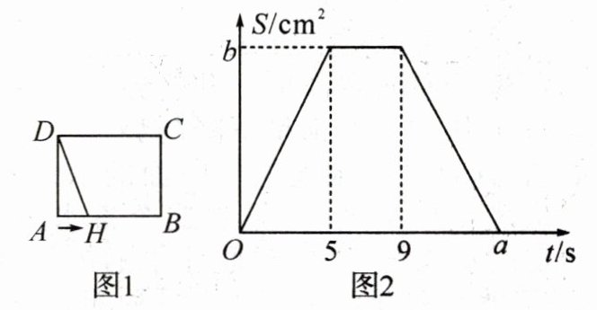 17. (14分)如图1,动点 $ H $ 以 $ 1 cm/s $ 的速度沿长方形 $ ABCD $ 按 $ A - B - C - D $ 的路径匀速运动,相应的 $ △HAD $ 的面积 $ S(cm^2) $ 与点 $ H $ 的运动时间 $ t(s) $ 的关系如图2,已知 $ AD = 4 cm $.