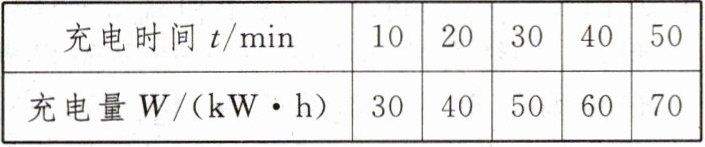 15. (10分)随着新能源技术的日益发展与提升,新能源汽车深受广大民众的喜爱.通过研究发现某款新能源汽车的充电量 $ W(kW·h) $ 与充电时间 $ t(min) $ 之间满足一次函数关系,小杰观察并记录了几组数据如下表: