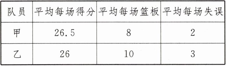 11. (2024·河南)为提升学生体质健康水平,促进学生全面发展,学校开展了丰富多彩的课外体育活动.在八年级组织的篮球联赛中,甲、乙两名队员表现优异,他们在近六场比赛中关于得分、篮板和失误三个方面的统计结果如下.