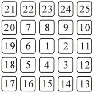 7. 将标有1~25号的25个座位按如图所示的方式摆放。甲、乙、丙、丁四人玩选座位游戏,甲选2个座位,乙选3个座位,丙选4个座位,丁选5个座位。游戏规则如下: