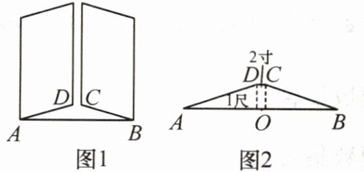 14. 新考向 数学文化 A|石家庄外国语校本经典题 《九章算术》是我国古代的数学代表作,书中记载:今有开门去阃(读kǔn,门槛的意思)一尺,不合二寸,问门广几何? 题目大意:如图1、图2(图2为图1的平面示意图),从点O处推开双门,双门间隙CD的长度为2寸,点C和点D到门槛AB的距离都为1尺(1尺= 10寸),则AB的长是 (