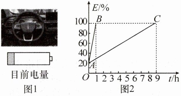 22. (10分)如图1,这是某款新能源汽车用充电器给汽车充电时,其屏幕的起始画面。经测试,在用快速充电器和普通充电器对该汽车充电时,其电量$E(\%)与充电时间t(h)$的函数图象分别为图2中的线段$AB$,$AC$。根据以上信息,回答下列问题: