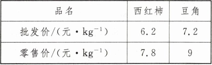 13. (10分)某校勤工俭学小组为筹集养老院春节文艺会演费用,他们用274元钱从蔬菜批发市场批发了西红柿和豆角共40kg到菜市场去卖,西红柿和豆角这天的批发价与零售价如下表所示: