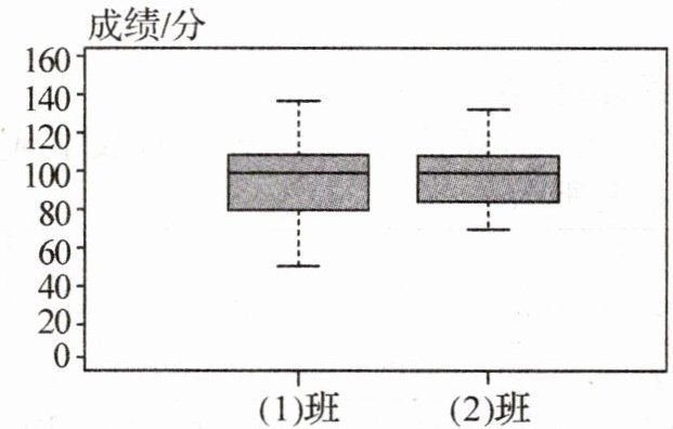 6. 已知(1)班和(2)班人数相等,在一次考试中两班成绩中位数相同,两班成绩的箱线图如下,下列判断正确的是 ()