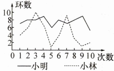 8. 有两名学员小林和小明练习飞镖,第一轮10枚飞镖掷完后两人命中的环数如图所示,已知新手的成绩不太稳定,那么根据图中的信息,估计小林和小明两人中新手是____.