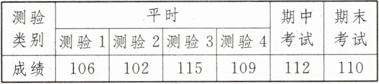 (1) 平时数学平均成绩为 $\frac{1}{4} \times(106+102+115+109)=\frac{1}{4} \times 432=108$ (分).