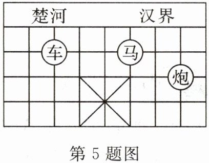 5. 如图,若在象棋盘上建立平面直角坐标系,使棋子“车”的坐标为$(-2,2)$,“马”的坐标为$(1,2)$,则棋子“炮”的坐标为 (