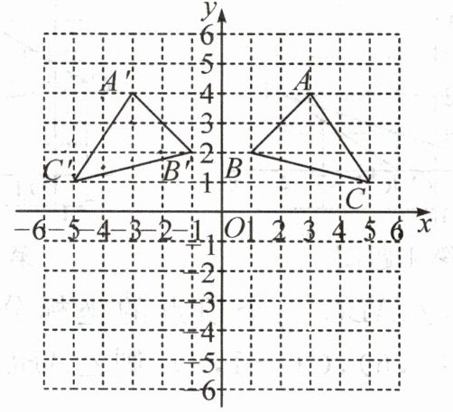 (1)△ABC 与△A'B'C'关于 y 轴对称。A(3,4),A'(-3,4),B(1,2),B'(-1,2),C(5,1),C'(-5,1),对应顶点的纵坐标相同,横坐标互为相反数。