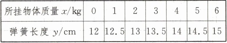 cm.(2)请写出弹簧长度$ y ( \mathrm { cm } ) 与所挂物体质量 x ( \mathrm { kg } ) $之间的关系式.(不必写出自变量的取值范围)
