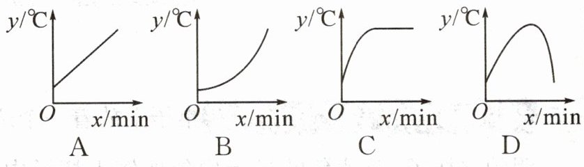 11. (2024·江西)将常温中的温度计插入一杯$ 60 ^ { \circ } \mathrm { C } $的热水(恒温)中,温度计的读数$ y ( ^ { \circ } \mathrm { C } ) 与时间 x ( \mathrm { min } ) $的关系用图象可近似表示为 (