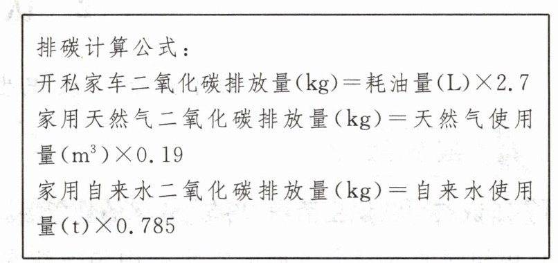 (3)小明家本月用天然气$ 20 \mathrm { m } ^ { 3 } $,自来水4t,私家车耗油量50L,请你计算一下小明家这几项的二氧化碳排放量.