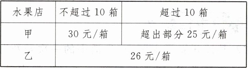 (1)甲水果店:不超过 10 箱,即当$0 ≤ x ≤ 10$时,$y = 30x$;超过 10 箱,即当$x > 10$时,$y = 30×10 + 25(x - 10) = 25x + 50$,$\therefore y = \begin{cases} 30x(0 ≤ x ≤ 10) \\ 25x + 50(x > 10) \end{cases}$。乙水果店:$\because$销售价格为 26 元/箱,$\therefore y = 26x$。