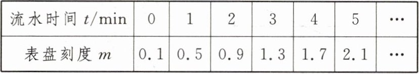 (1)表盘刻度与流水时间之间的关系式为$m = 0.4t + 0.1$。