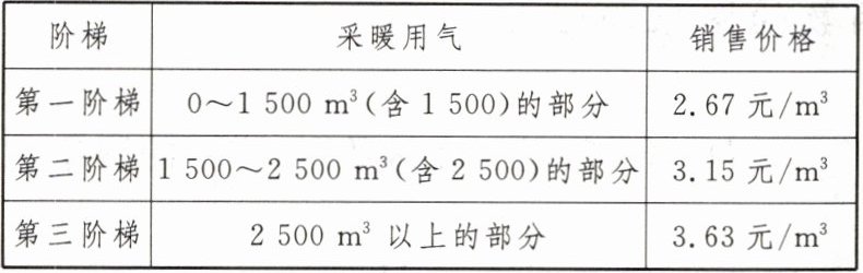 (1) 设某户这个冬季用气量为$x m^3(1500<x≤2500),$缴纳燃气费用为y元,求y与x之间的关系式.