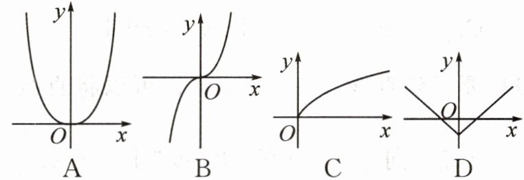 答:“当$x>0$时,$y= 2x>0$,此时描出的点都在第一象限;当$x<0$时,$y= 2x<0$,此时描出的点都在第三象限. 所以函数$y= 2x$的图象一定经过第一、三象限.”大家不禁为善于思考的小亮鼓掌. 最后何老师又给大家留了一道思考题:下面四个图象中哪个是函数$y= \sqrt{x}$的图象 (
