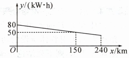 4. (2024·陕西)我国新能源汽车快速健康发展,续航里程不断提升,王师傅驾驶一辆纯电动汽车从A市前往B市.他驾车从A市一高速公路入口驶入时,该车的剩余电量是80kW·h,行驶了240km后,从B市一高速公路出口驶出.已知该车在高速公路上行驶的过程中,剩余电量y(kW·h)与行驶路程x(km)之间的关系如图所示.