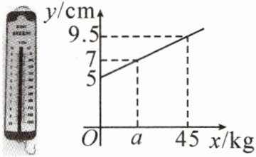 1. 如图,一个条形测力计不挂重物时长5cm,挂上重物后,在弹性限度内弹簧伸长的长度与所挂重物的质量成正比,弹簧总长y(cm)关于所挂物体质量x(kg)的函数图象如图所示,则图中a的值是(
