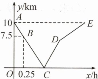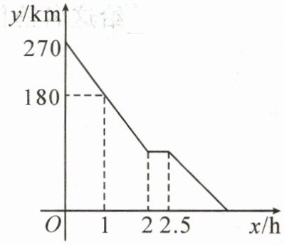 10. 小蕾家与外婆家相距270km,她假期去看望外婆,返回时,恰好有一辆顺风车可以带小蕾到A服务区,于是,小蕾与爸爸约定,她先搭乘顺风车到A服务区,爸爸驾车到A服务区接小蕾回家.两人在A服务区见面后,休息了一会儿,然后小蕾乘坐爸爸的车以60km/h的速度返回家中.在小蕾的整个行程中,小蕾与自己家的距离y(km)和时间x(h)之间的关系如图所示.