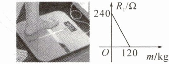 9. 新考向 跨学科 电子体重秤原理是利用力传感器在置物平台上放上重物后,使表面发生形变而引发了内置电阻的形状变化,电阻的形变必然引发电阻值的变化,电阻值的变化又使内部电流发生变化产生了相应的电信号,电信号经过处理后就成了可视数字.简易电子秤制作方法:制作一个装有踏板(踏板质量忽略不计)的可变电阻$R_1,$已知$R_1$与踏板上人的质量m之间的关系式为$R_1= km+b($其中k,b为常数,0≤m≤120),如图所示.下列说法不正确的是(