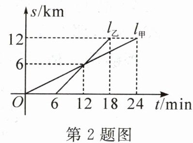 2. 如图,甲、乙两人以相同路线前往离学校12km的地方参加植树活动,图中$l_{甲}$,$l_{乙}$分别表示甲、乙两人前往目的地所行驶的路程$s(km)与时间t(min)$的关系. 根据图象判断下列说法错误的是(