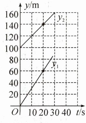 (2)将点$(20,60)$代入$y_{1}=k_{1}t$,得$k_{1}=3$。根据题意,得$100=b$,① $140=20k_{2}+b$。② 将①代入②,得$k_{2}=2$。$k_{2}$的实际意义是小亮的速度是$2m/s$。