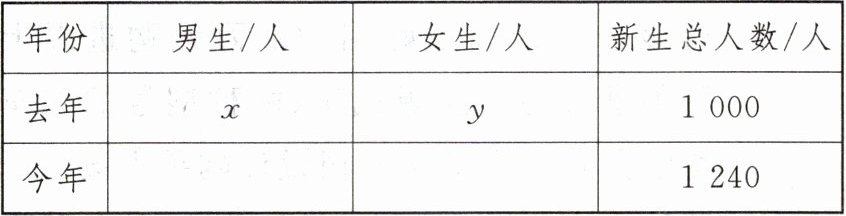 1. 某校去年原计划招收初一新生1000人,今年实际招到初一新生1240人,其中男生超20%,女生超30%.设该校去年计划招收男生x人,招收女生y人.