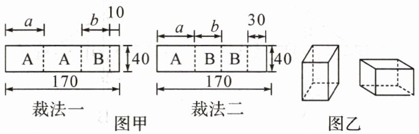 (2)在试生产阶段,若将 30 张标准板材用裁法一裁剪,4 张标准板材用裁法二裁剪,再将得到的 A 型与 B 型板材做侧面和底面,做成图乙的竖式(底面为 B 型)与横式(底面为 A 型)两种礼品盒.