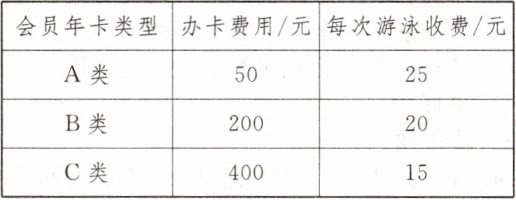 例如,购买A类会员年卡,一年内游泳20次,消费 $ 50 + 25×20 = 550 $(元).下列说法不正确的是()