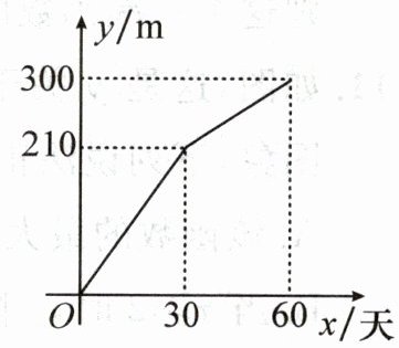 (2)设乙组停工后,$ y $ 关于 $ x $ 的函数表达式为 $ y = kx + b $。$ \because $ 点 $ (30, 210) $,$ (60, 300) $ 在图象上,$ \therefore \begin{cases} 30k + b = 210, \\ 60k + b = 300, \end{cases} $ 解得 $ \begin{cases} k = 3, \\ b = 120. \end{cases} $ $ \therefore y $ 关于 $ x $ 的函数表达式为 $ y = 3x + 120 (30 \leq x \leq 60) $。
