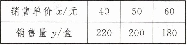 1. 某水果店推出的一款水果拼盘套餐受到了广大消费者的喜爱,每天的销售量 y(盒)与销售单价 x(元)之间存在一次函数关系(如下表所示).已知该水果拼盘套餐的成本为 30 元/盒.