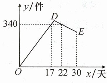 2. 某公司开发出一款新的节能产品,该产品的成本价为 6 元/件.该产品在正式投放市场前通过代销点进行了为期一个月(30 天)的试销售,售价为 8 元/件.工作人员对销售情况进行了跟踪记录,并将记录情况绘成图象(如图所示),图中的折线 ODE 表示日销售量 y(件)与销售时间 x(天)之间的函数关系.已知线段 DE 表示的函数关系中时间每增加 1 天,日销售量减少 5 件.