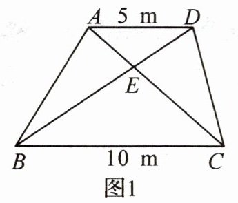 ∵梯形 $ABCD$ 的边 $AD// BC$,$\therefore \triangle ABC$ 的面积等于 $\triangle BCD$ 的面积。$\therefore \triangle AEB$ 与 $\triangle DEC$ 的面积相等。(2)$\because \triangle APB\cong\triangle DPC$,$\therefore$ 点 $P$ 在梯形 $ABCD$ 的对称轴上。$\because AD = 5m$,$BC = 10m$,$S_{\triangle APD}=S_{\triangle BPC}$,$\therefore$ 点 $P$ 到 $AD$ 的距离等于到 $BC$ 的距离的2倍。点 $P$ 的位置图略。