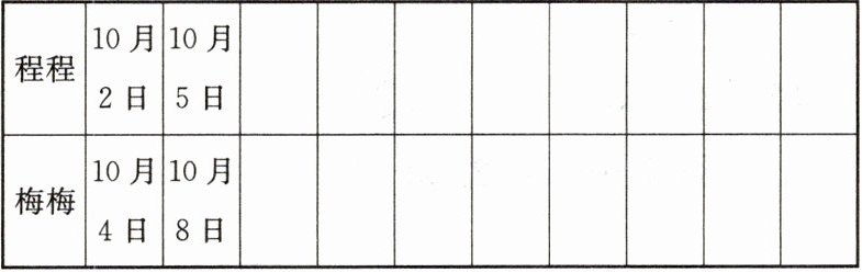 2. 程程和梅梅为敬老院打扫卫生,程程10月2日去了敬老院,以后每3天去一次,梅梅10月4日去了敬老院,以后每4天去一次.列表算一算10月份他们同时去敬老院的有哪些日期.
