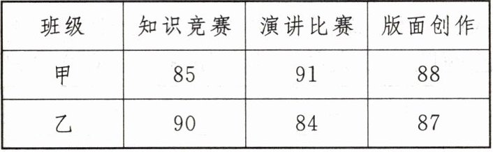 (2)如果将知识竞赛、演讲比赛、版面创作按5:3:2的比例确定最终成绩,请通过计算说明甲、乙两班谁将获胜.