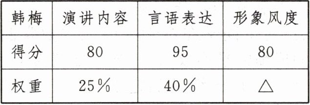5. 下表是韩梅参加演讲比赛的得分表(单位:分),表格中“△”部分被污损,她的总得分是(