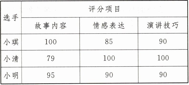 若故事内容、情感表达、演讲技巧按4:3:3的加权平均分决定冠军、亚军、季军,则冠军、亚军、季军分别是(