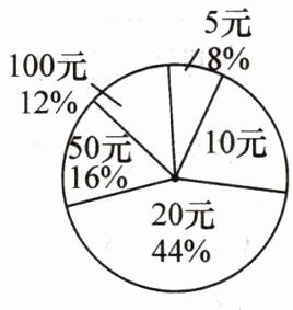 3. 在一次捐款活动中,某班50名同学都拿出自己的零花钱,有捐5元、10元、20元的,还有捐50元和100元的.如图所示的统计图反映了不同捐款数的人数比例,那么该班同学平均每人捐款(