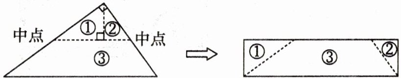 如图,取三角形两边中点,连接并作垂线,按图拼接(具体图形略,原理是利用中点连线和平行线性质,通过平移、旋转等操作拼接)。
