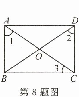 8. 如图,在$□ ABCD$中,下列条件:①$AC = BD$;②$\angle 1+\angle 3 = 90^{\circ}$;③$OB= \frac{1}{2}AC$;④$\angle 1 = \angle 2$。其中能判定$□ ABCD$是矩形的有(