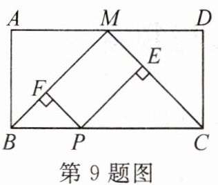 9. 如图,在矩形 $ABCD$ 中,$M$ 为边 $AD$ 的中点,$P$ 为 $BC$ 上一点,$PE\perp MC$,$PF\perp MB$。当 $AB$,$BC$ 满足条件