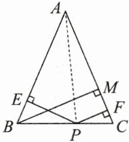 $\because AB= AC,\therefore PE+PF= BM$.