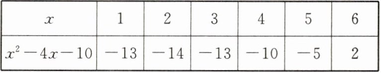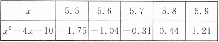 5. (教材P33“做一做”变式)“一块矩形铁片,面积为$10m^{2}$,长比宽多4m,求铁片的长.”小颖在做这道题时,是这样考虑的:设铁片的长为xm,列出方程为$x(x-4)= 10$,整理,得$x^{2}-4x-10= 0$.小颖列出方程后,想知道铁片的长到底是多少,下面是她的探索过程.