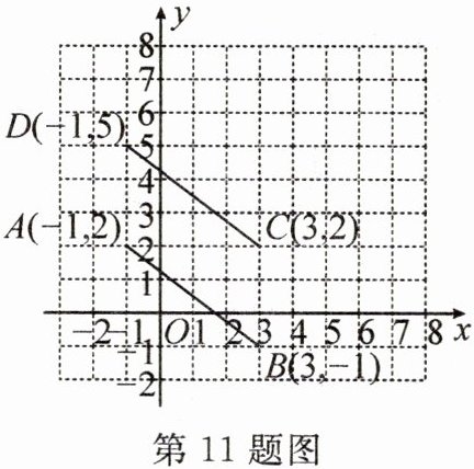11. 如图,线段AB,CD端点的坐标分别为$A(-1,2)$,$B(3,-1)$,$C(3,2)$,$D(-1,5)$,且$AB// CD$,将CD平移至第一象限内,得到$C'D'(C',D'$均在格点上). 要使四边形$ABC'D'$是菱形,则所有满足条件的点$D'$的坐标为