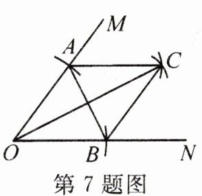 7. 如图,在∠MON的两边上分别截取OA,OB,使OA= OB,分别以点A,B为圆心,OA的长为半径作弧,两弧交于点C,连接AC,BC,AB,OC.若AB= 2cm,四边形OACB的面积为$4cm^2,$则OC的长为